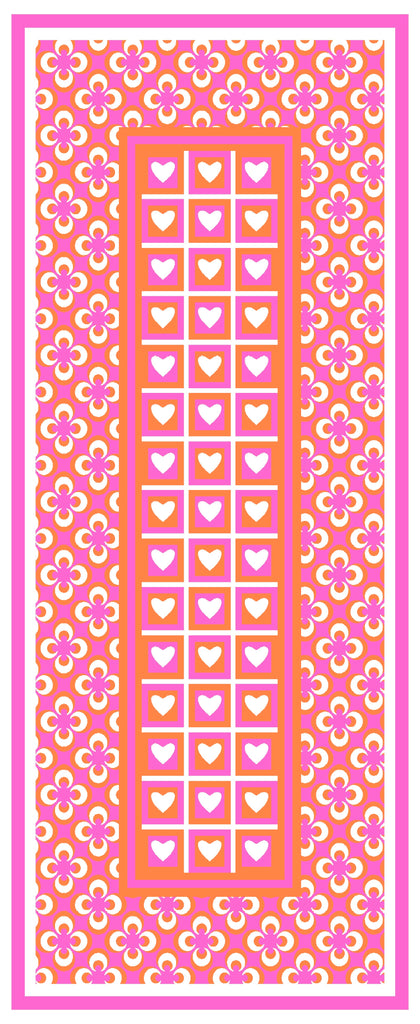 The Loved Up Scarf is covered in pink and orange hearts....
