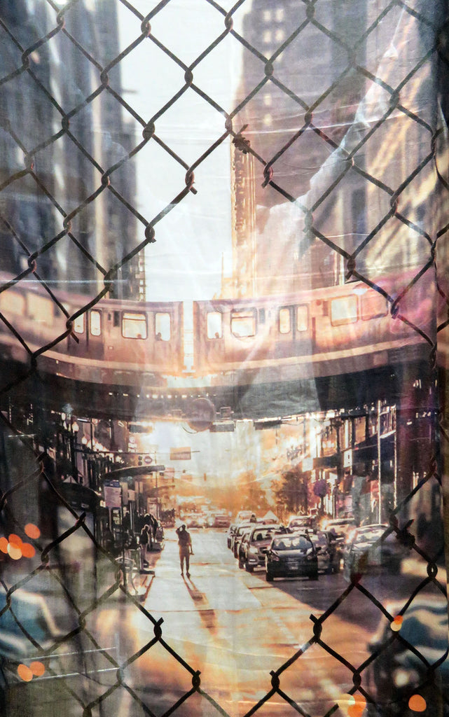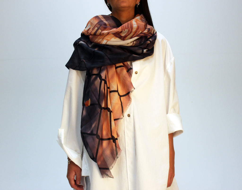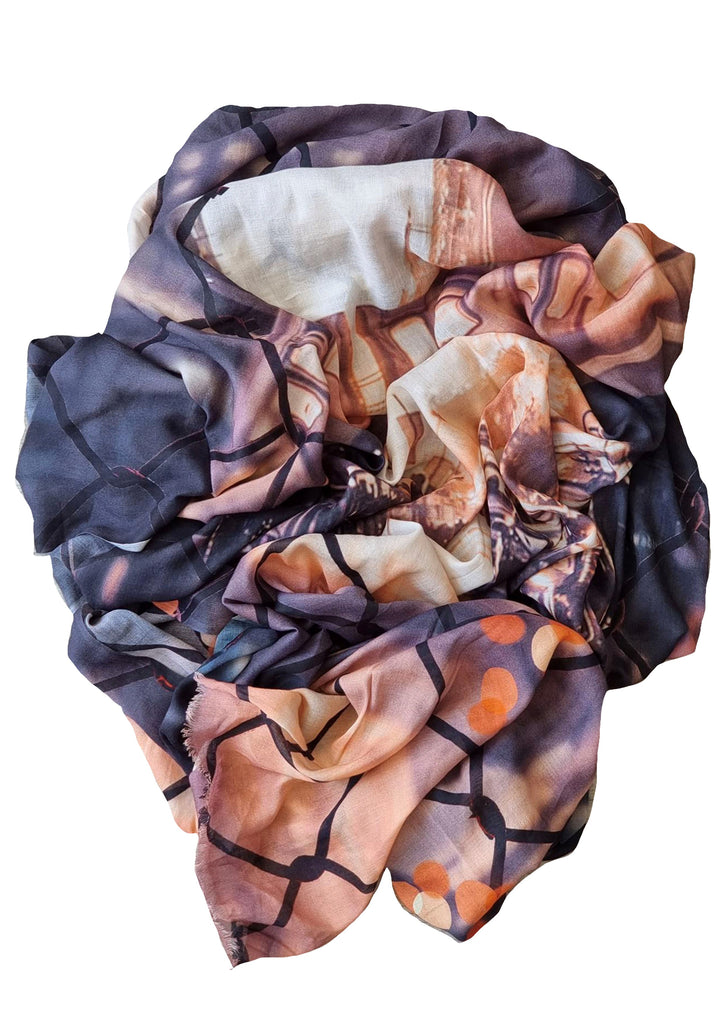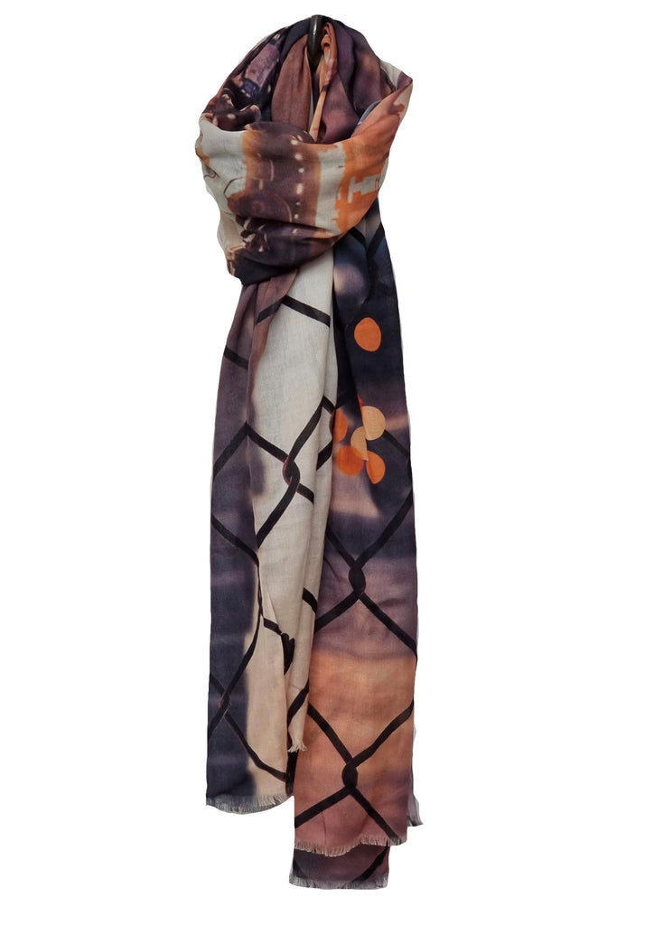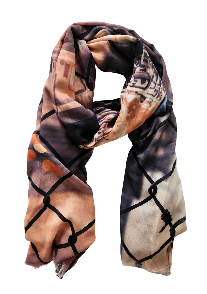 The New York scene scarf has a smooth lightweight soft & silky mix fabric in a neutral/ecru tones with images of New York tube and street scene through a cable fence.......  Tones of slate, peach, orange, black and ecru.