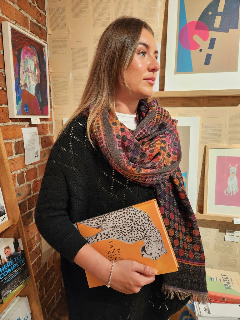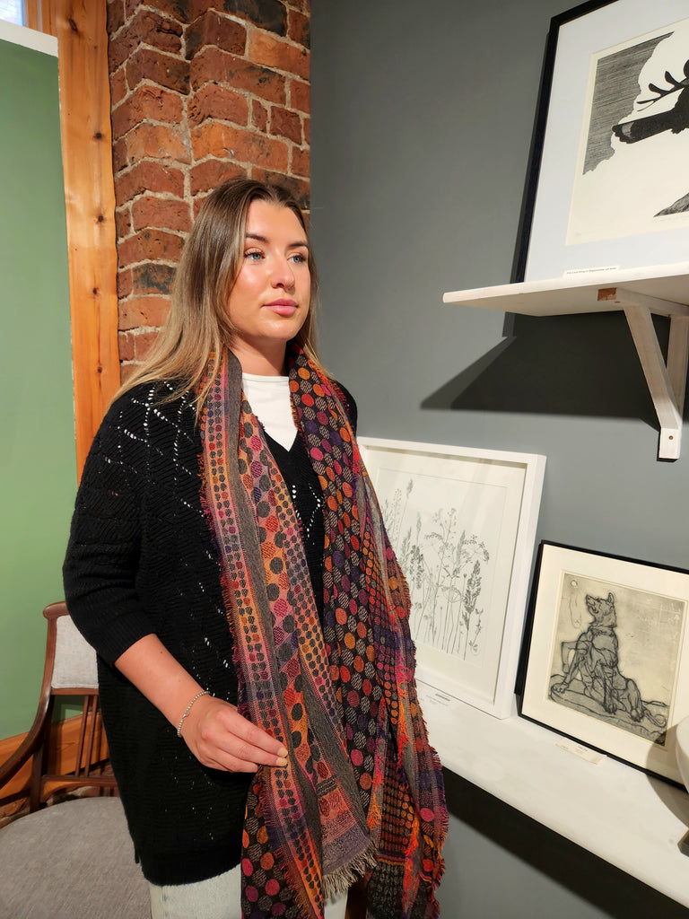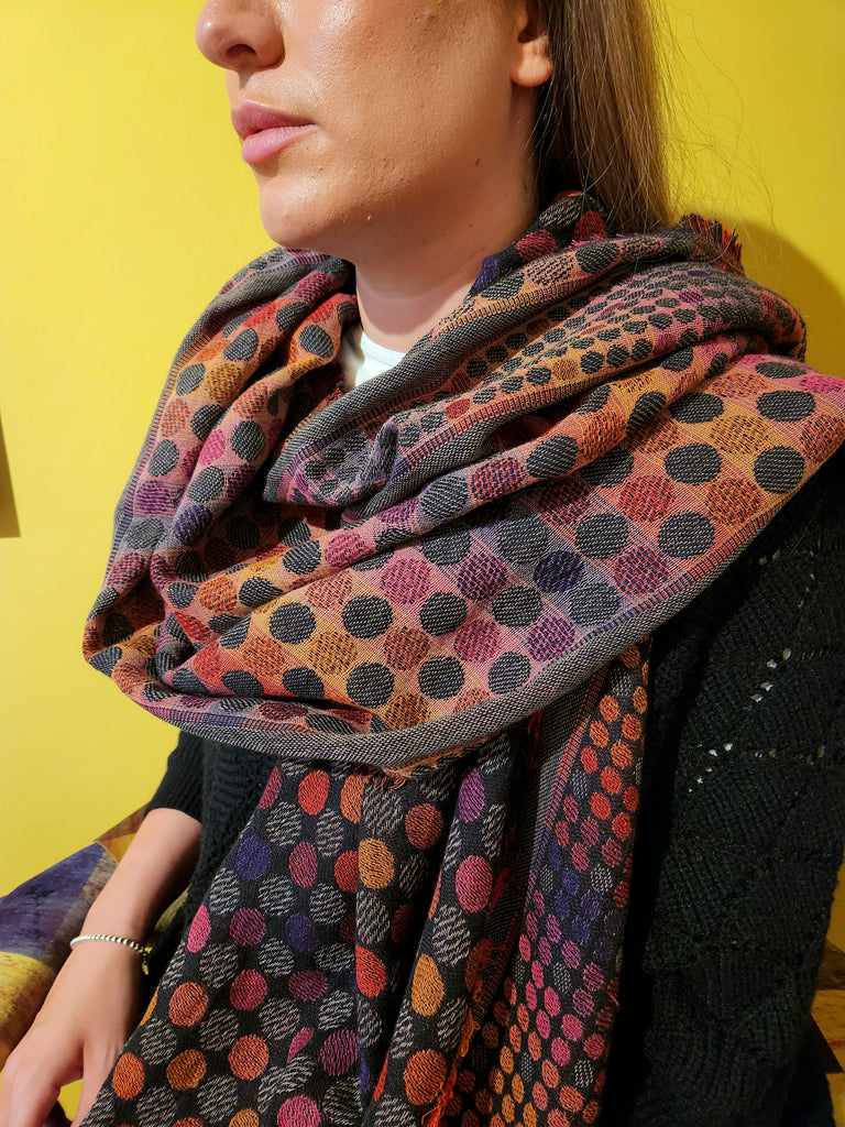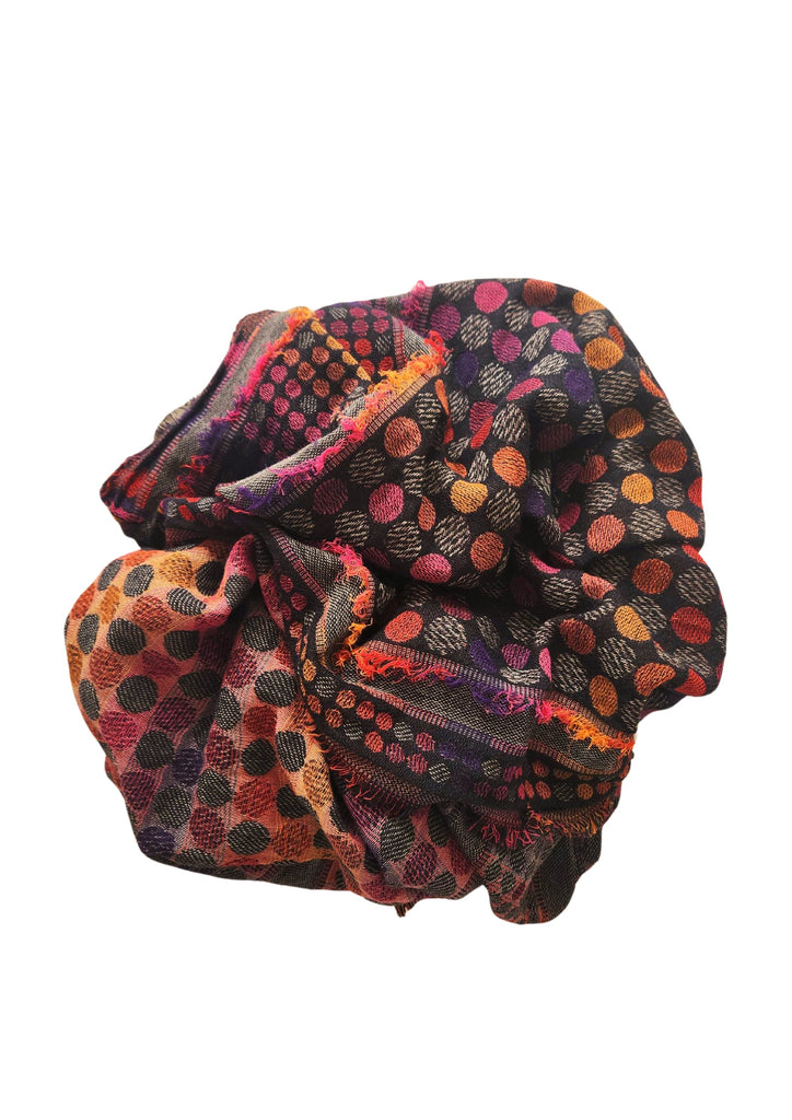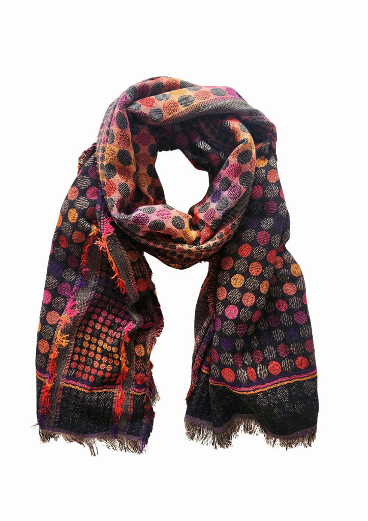 The Dotty scarf has a soft black base, complimented with dot tones of purple, pink, mauve, pale rust and a gold tone of colours......