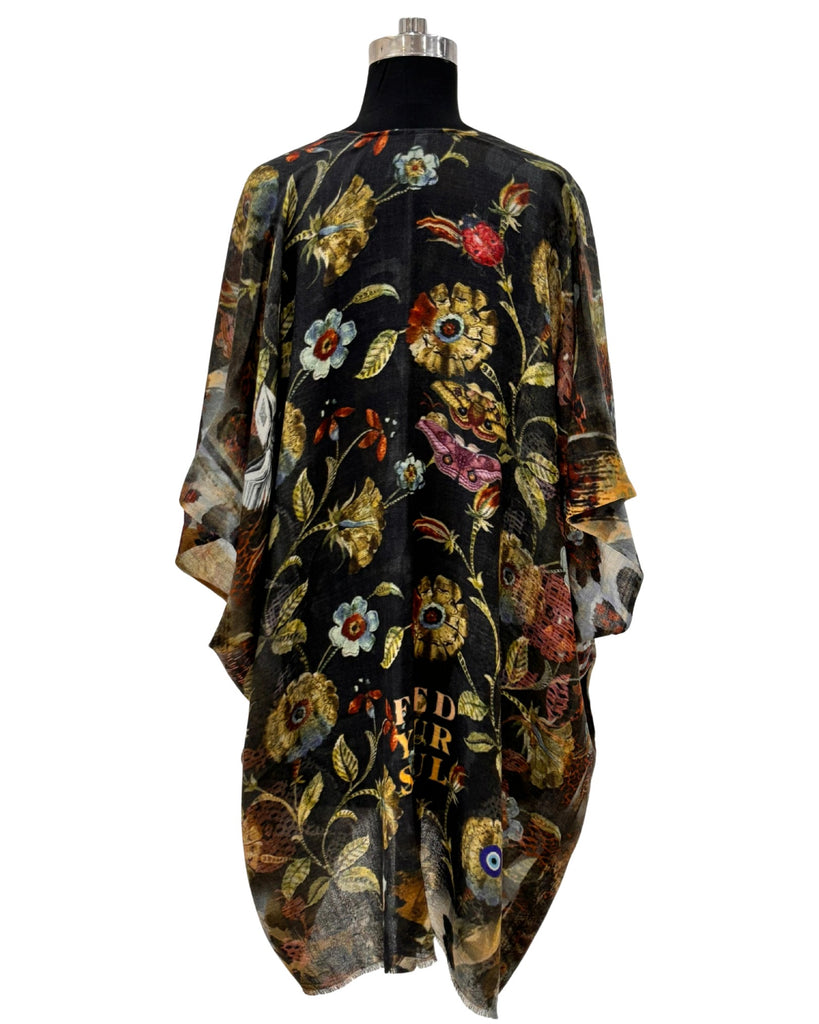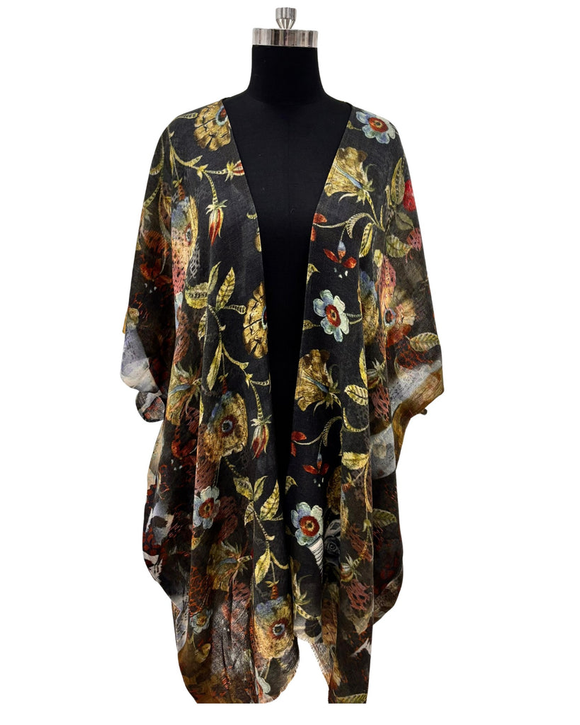 The Salisa Spirited Blooms throwover is an amazing all seasons multi-functional wrap/scarf, and is a “must have” for your wardrobe. This style has elbow length arms, so can be used as a scarf by using the arm holes.